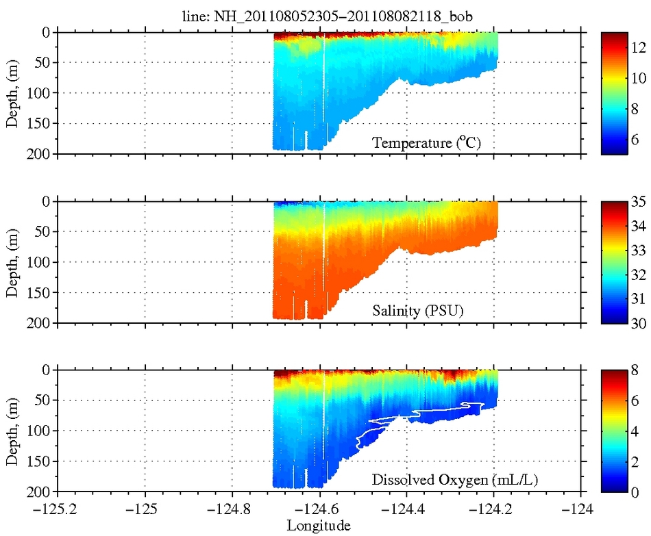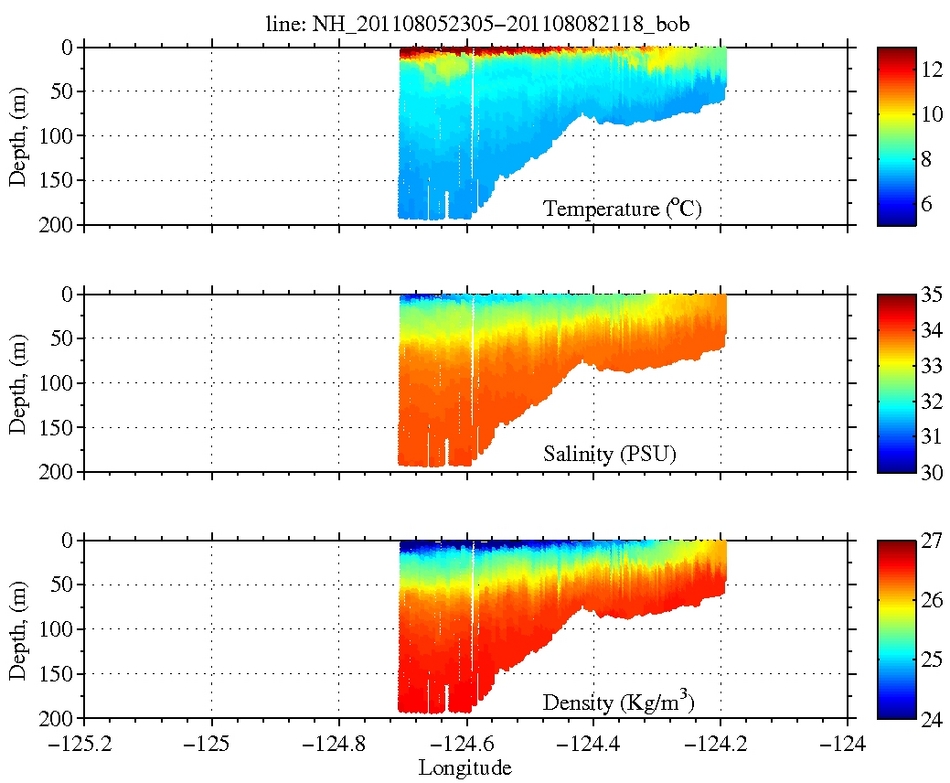 Temperature, Salinity,<br>and Density Temperature, Salinity,<br>and Oxygen Temperature, Salinity,<br>and Oxygen Chlorophyll, CDOM,<br>and Backscatter